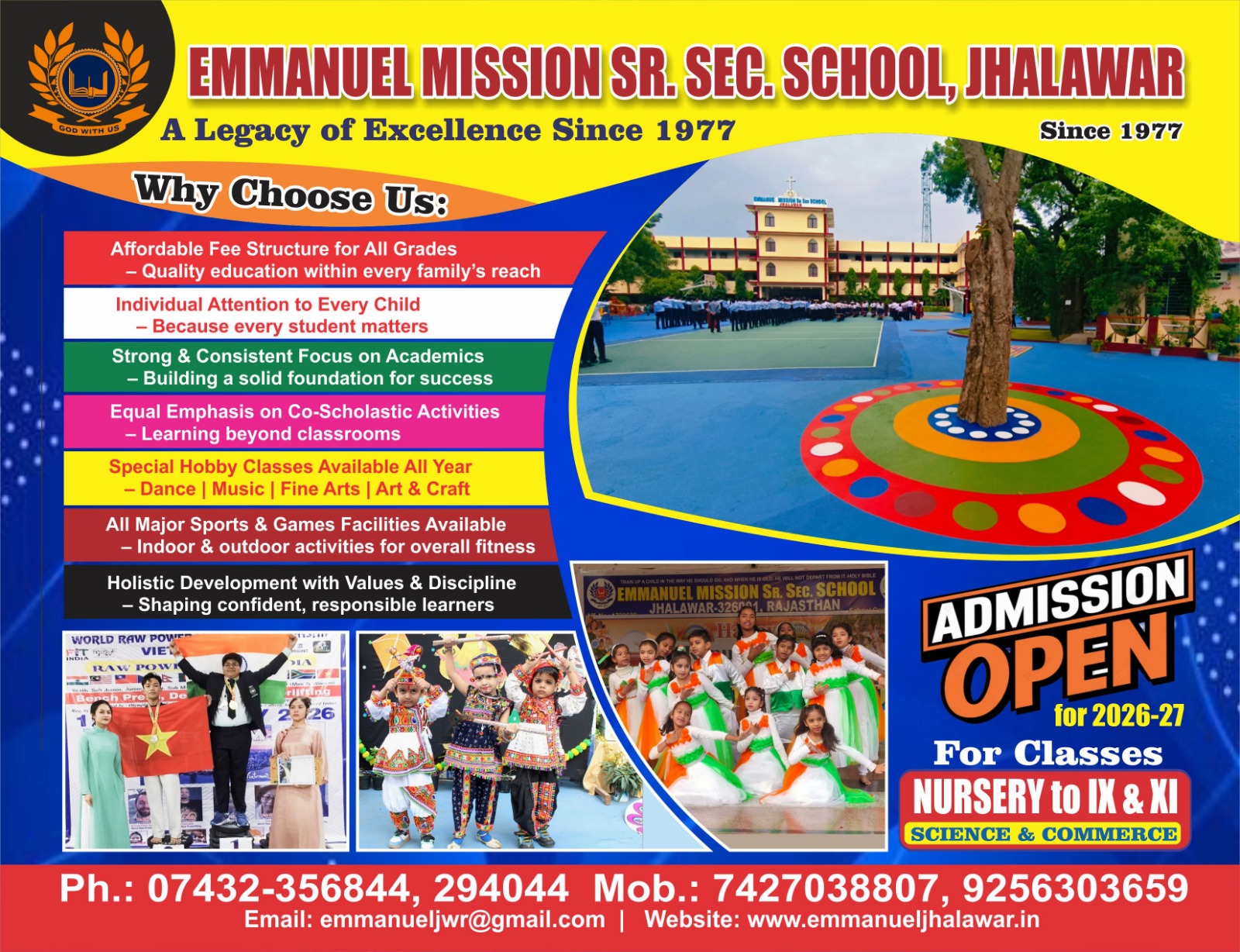 Emmanuel Mission Sr. Sec. School, Jhalawar was established on 10th May 1977, runs under the aegis of “Emmanuel Education & Charitable Society, Jaipur”. It is an English medium Co-Educational School. It is a CBSE affiliated school which is committed to provide quality education with strong faith of Indian values. Here learning is fun filled, meaningful, highly disciplined, effective, interactive and up to the international standards. The school strictly follows CBSE curriculum ad has added some unique syllabus of International Standards.